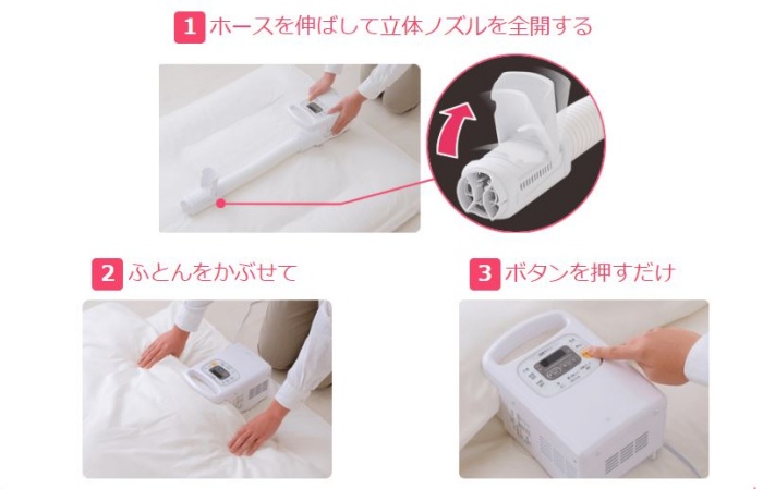 FK-C3とFK-W1はマットや袋が不要で、布団にノズルを挿すだけで使えます。