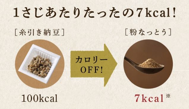 普通の納豆は1パック100kcalほどですが、粉なっとうはなんと1さじたったの7kcal!