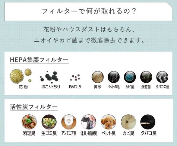 このフィルターで花粉やハウスダストはもちろん、ニオイやカビ菌までしっかり除去できます。