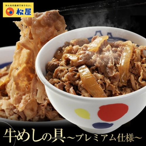 松屋の牛めしの具のプレミアム仕様は、旨味のあるアメリカ産牛肉をブレンドしています。