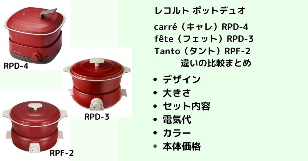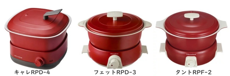レコルトのポットデュオ キャレRPD-4・フェットRPD-3・タントRPF-2の違いは以下の6つです。